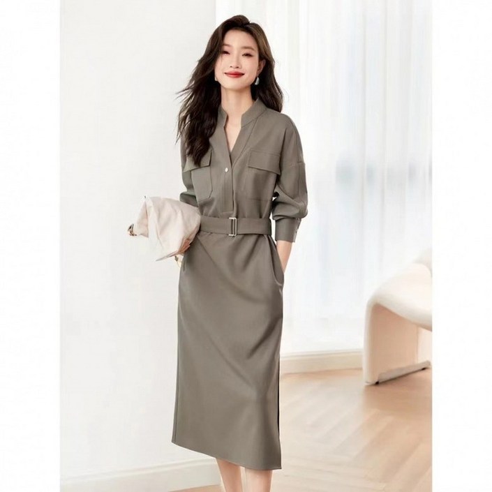 스타일닥터 여성 롱 원피스 패션 카라넥 긴팔 캐주얼 원피스 셔츠원피스 봄가을 벨트 무료 증정